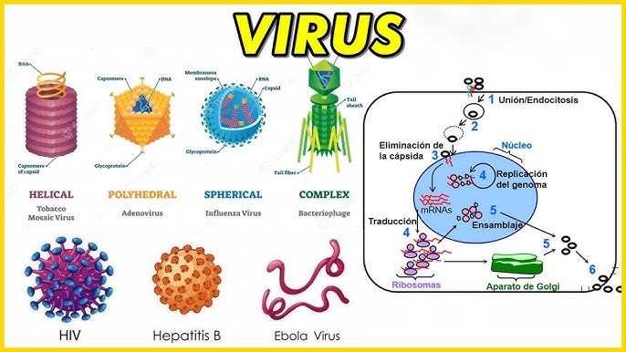 Un virus es un partícula infecciosa que se reproduce al "apoderarse" de una célula hospedera y utilizar su maquinaria para crear más virus. Un virus se compone de un genoma de ADN o ARN en el interior de una cubierta de proteína llamada cápside. Algunos virus tienen una envoltura de membrana externa.